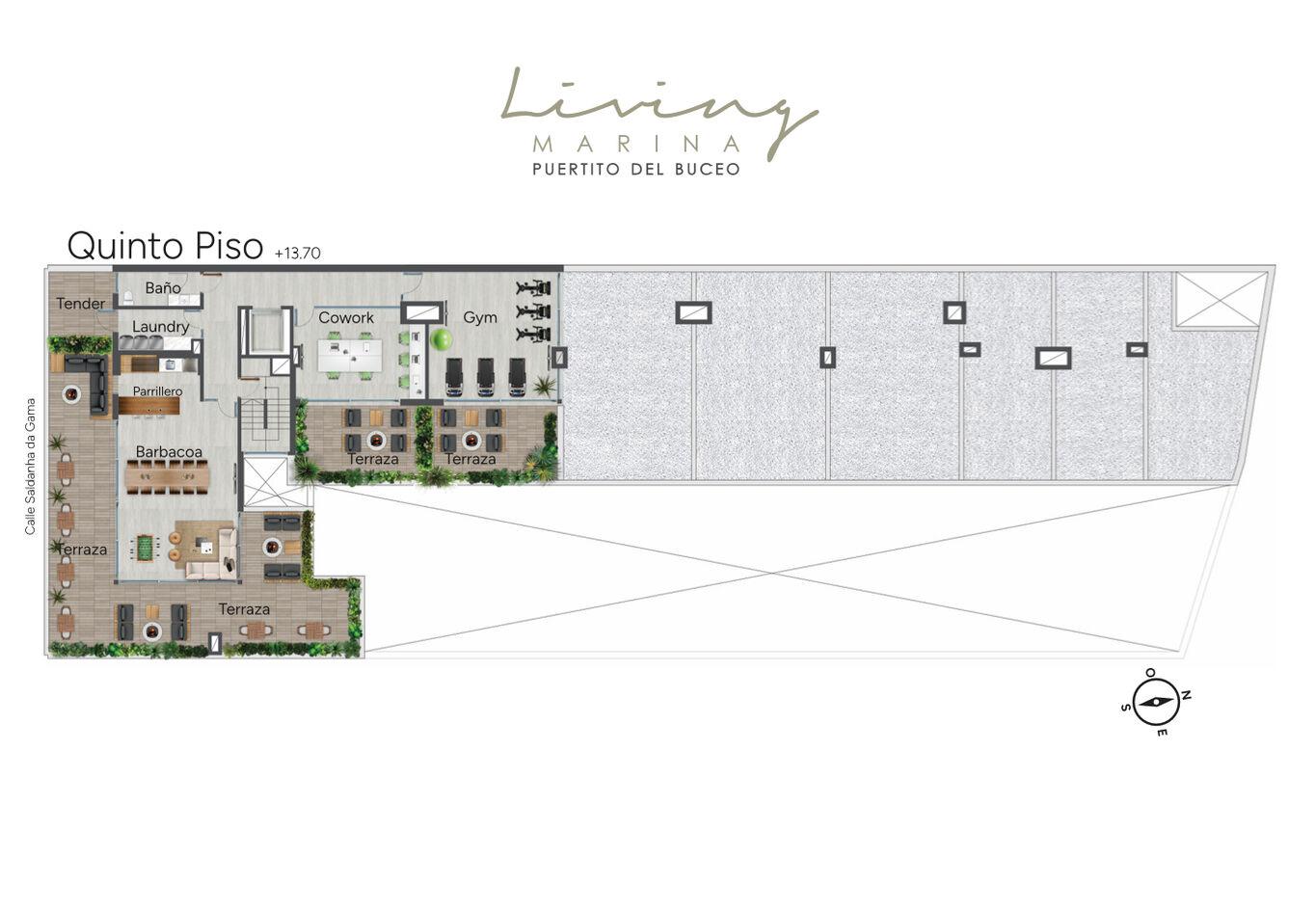 El piso 5 cuenta con barbacoa cerrada con parrillero, sala cowork, lavadero, gym y baño accesible de uso común.