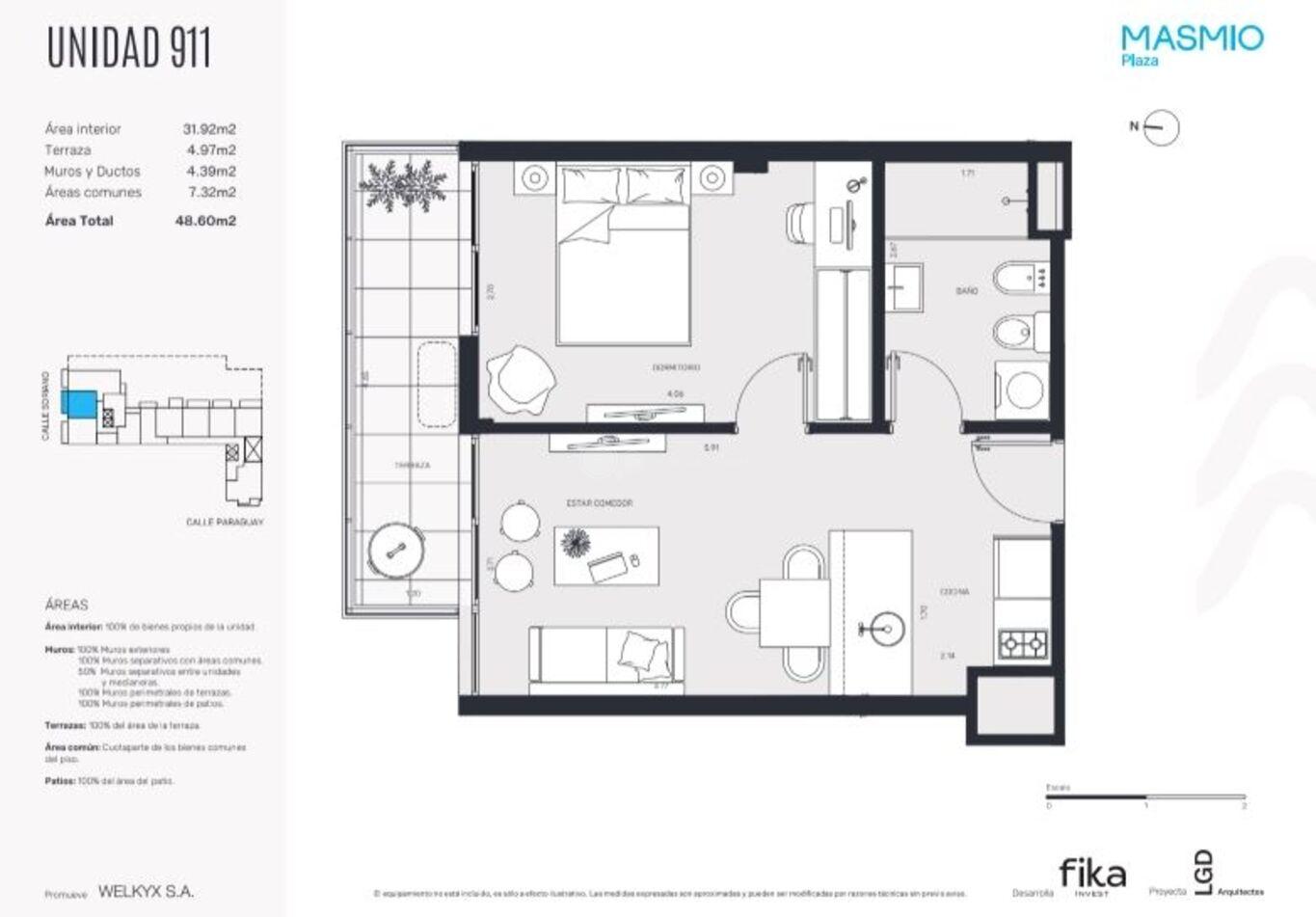 Su metraje es de 36 m2 propios + 5 m2 de Terraza.
